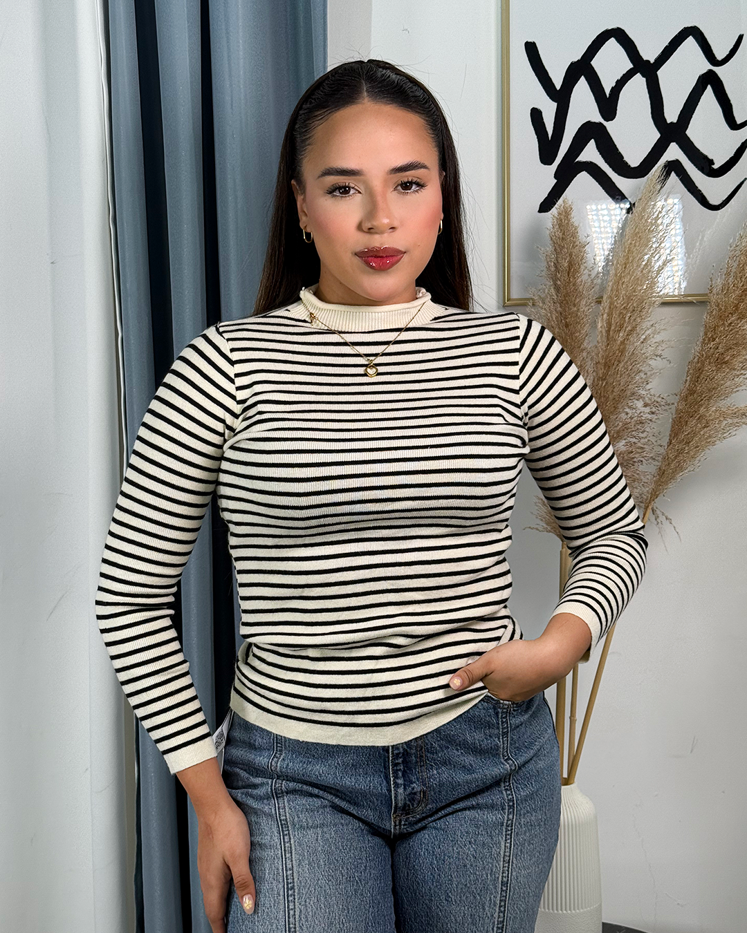 Este suéter de rayas con cuello semi alto combina estilo y comodidad para mantenerte abrigado con elegancia. Su diseño clásico y versátil lo hace ideal para cualquier ocasión, mientras que el cuello semi alto ofrece protección adicional contra el frío sin sacrificar la comodidad. Perfecto para renovar tu guardarropa con una prenda que destaca por su calidad y diseño atemporal.
