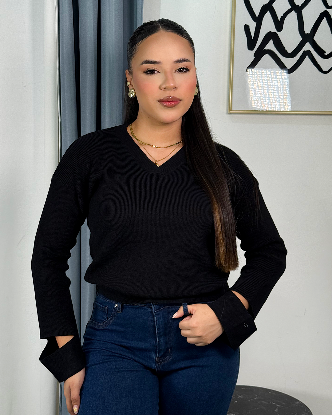 Este suéter tejido presenta un diseño único con aberturas en las mangas que aportan un toque de sofisticación y estilo contemporáneo. Su confección cuidadosa garantiza comodidad y calidez, mientras que las aberturas permiten mayor movilidad y un aire fresco para cualquier ocasión. Ideal para quienes buscan combinar elegancia y funcionalidad en su vestuario.